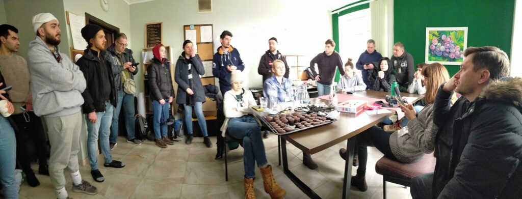 «В нас є люди, які займаються евакуацією і організовують автобуси за кордон. В нас є люди відповідальні за прийом гуманітарної допомоги. […] В нас є люди, які відповідають за кухню і розселення. […] IT-шники зробити QR-код, щоб люди на вокзалах могли нас знайти. Також в нас є гаряча лінія, де 5-6 людей приймають дзвінки щодо розселення та поїздок за кордон»