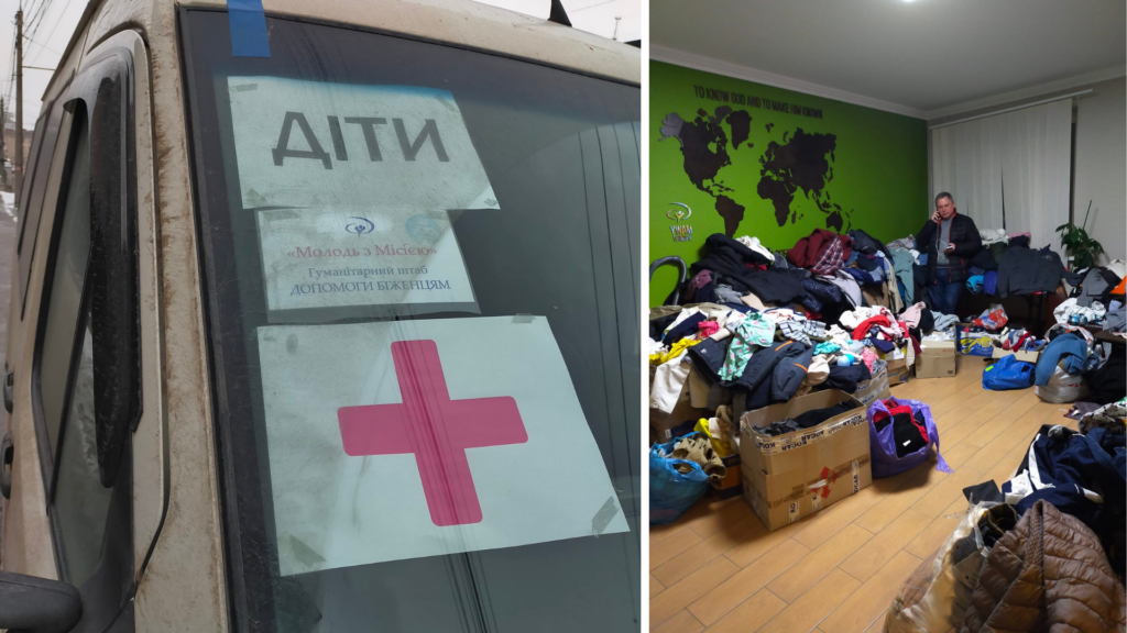 Ярослав зі служителем – зліва; полиці заповнені речами для біженців – справа. Фото з Фейсбук-сторінки Ярослава Я.
