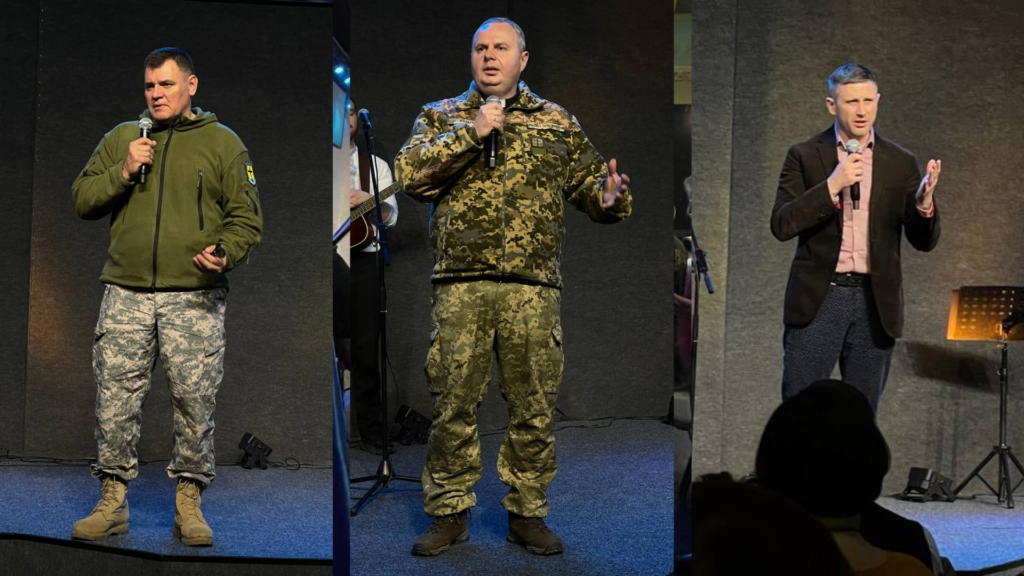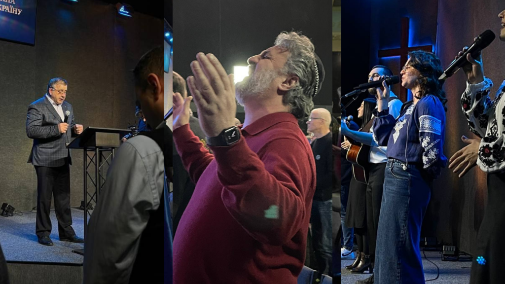 Фото (зліва – направо): М. Мокієнко – єпископ Дніпропетровського відділення УЦХВЄ; Влад Кулумбегов, служитель КЄМО; прославлення